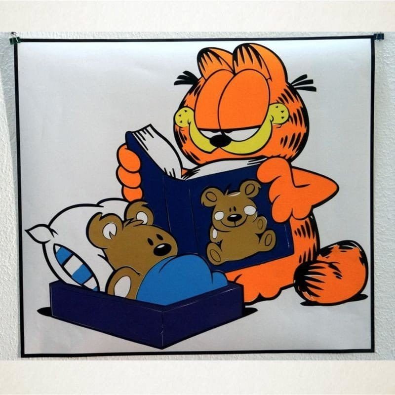 Garfield en este diseño esta en una actitud cariñosa leyendole cuentos a su osito.