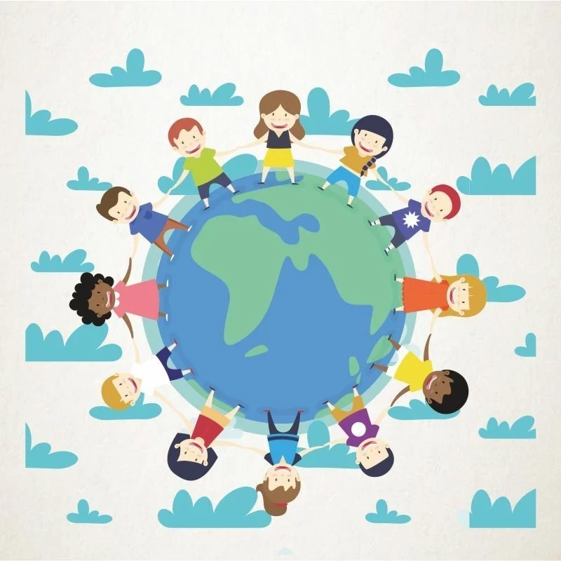 Composición de un planeta con niños de diferentes razas compartiendo la alegria de ser felices en un planeta azul, las nubes se pueden disponer de diferntes formas para personlizar este esperanzador diseño.